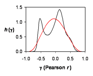 These correlations exhibit substantial between-studies heterogeneity, and we can estimate the distribution of correlation parameters using a relatively simple mixture strategy. Here’s the basic idea: Use an EM algorithm to estimate the mean and variance of each study’s posterior distribution of Fisher-z parameters, then estimate the distribution of Fisher-z or Pearson-r parameters as an equally weighted mixture of these posteriors. Figure 1 shows the estimated mixture density (i.e., p.d.f.) for Fisher-z parameters, with a superimposed normal density that has the same mean (-0.04) and variance (0.362), and Figure 2 shows the Pearson-r counterparts.
