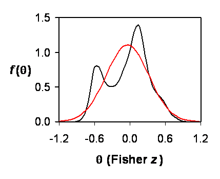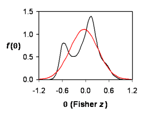 Figure 1. Density (p.d.f.) for Fisher-z parameters estimated from Becker’s (2009) 10 correlations using mixture (black) or normal (red).